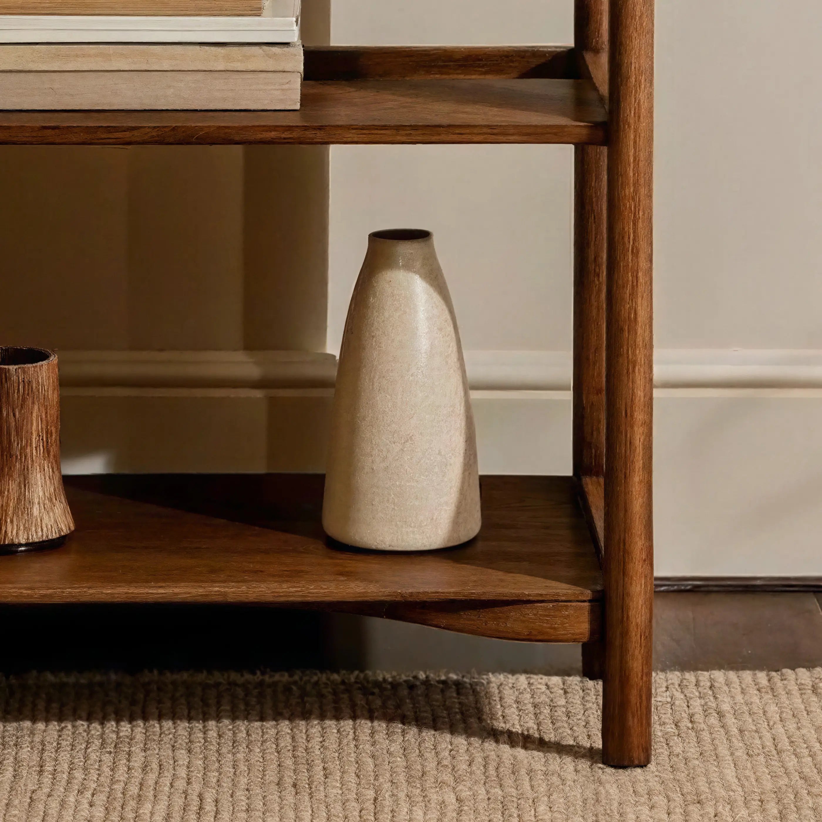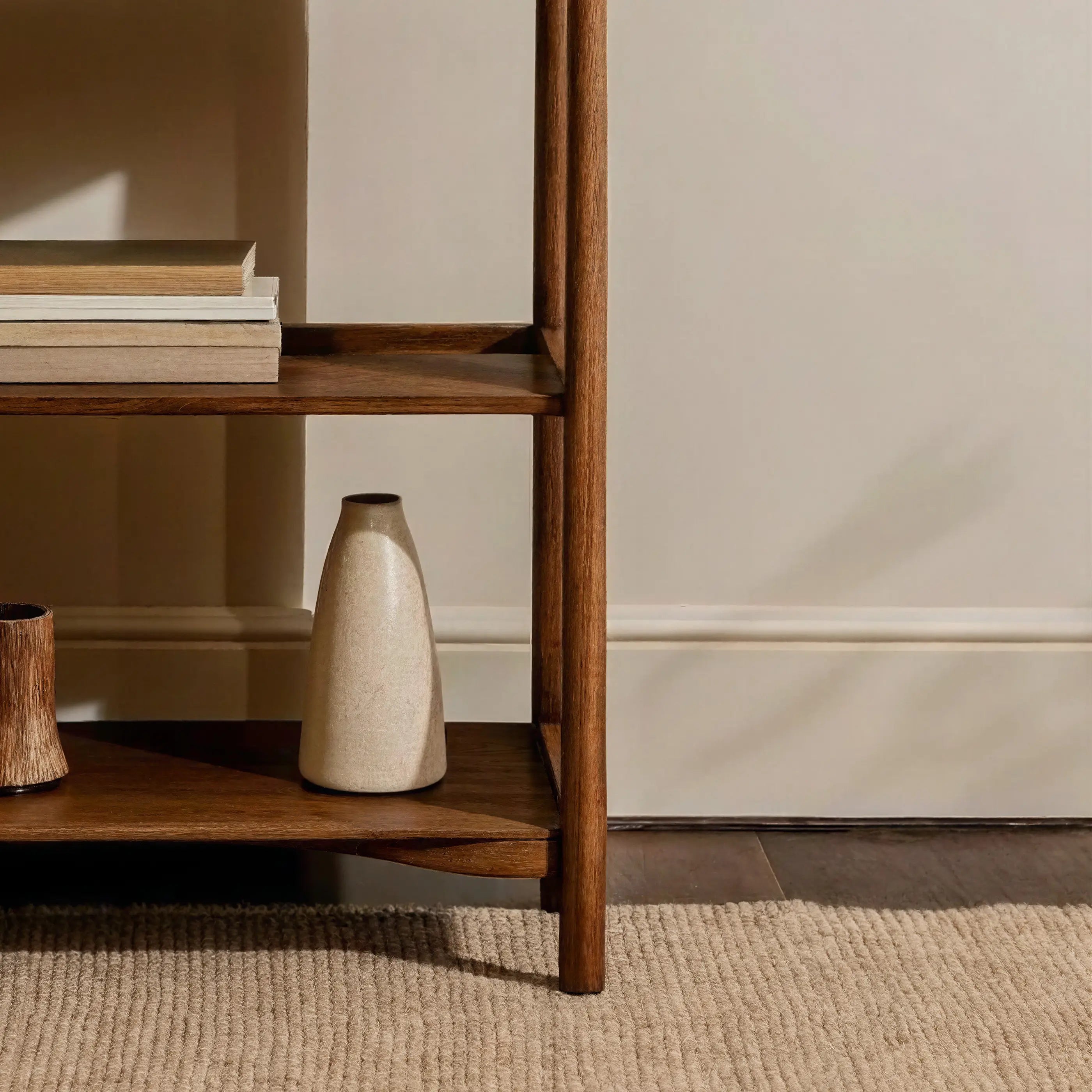 An open wooden shelving unit with light proportions, offering vertical storage for books and objects.