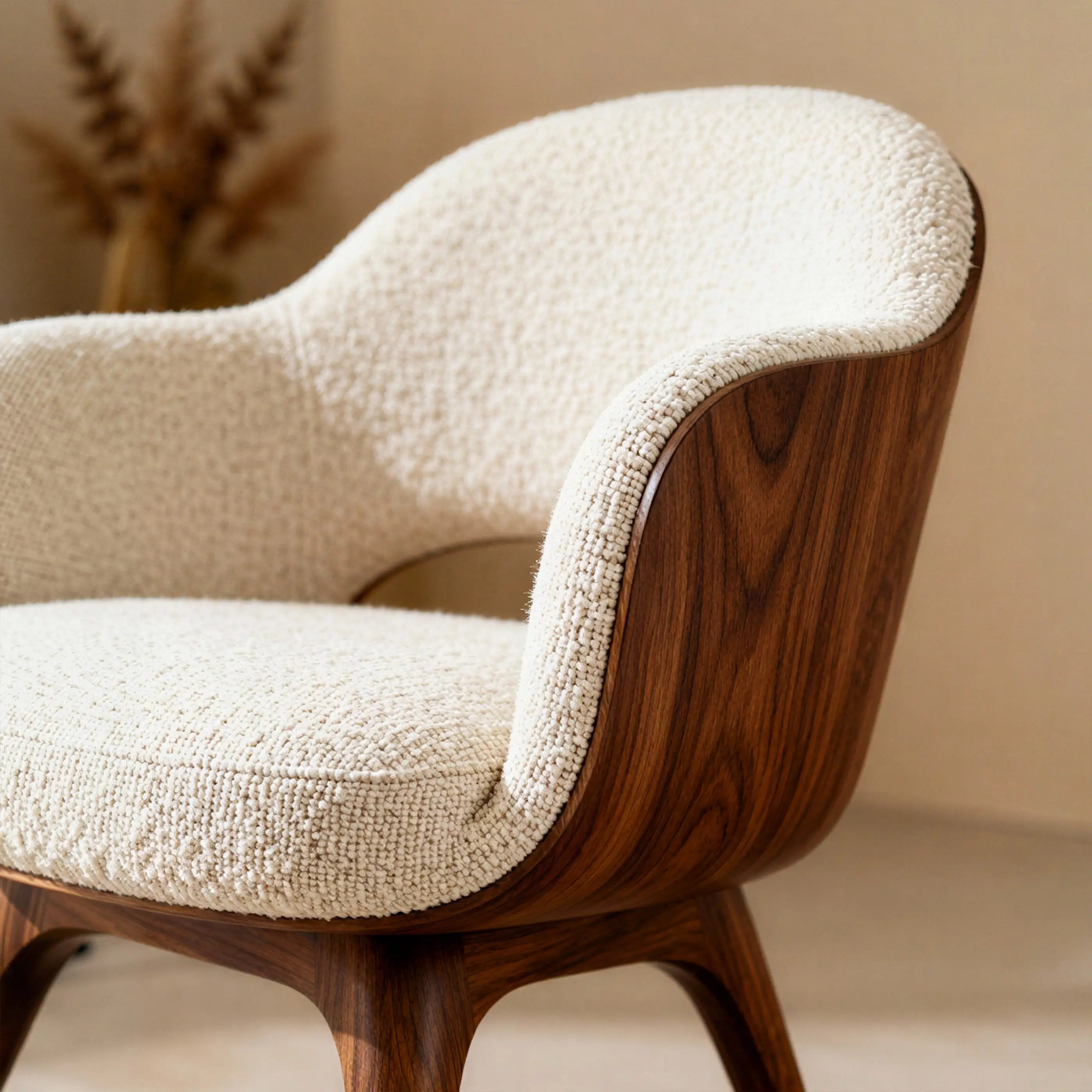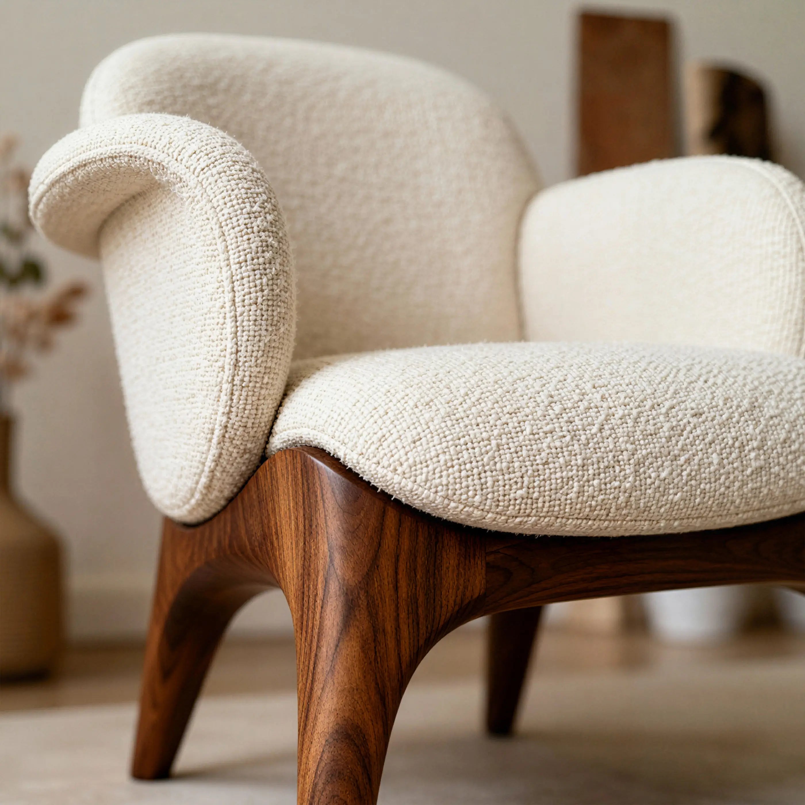 An upholstered lounge chair with a wrapped wooden shell, offering comfort, softness, and sculptural warmth for relaxed interiors.