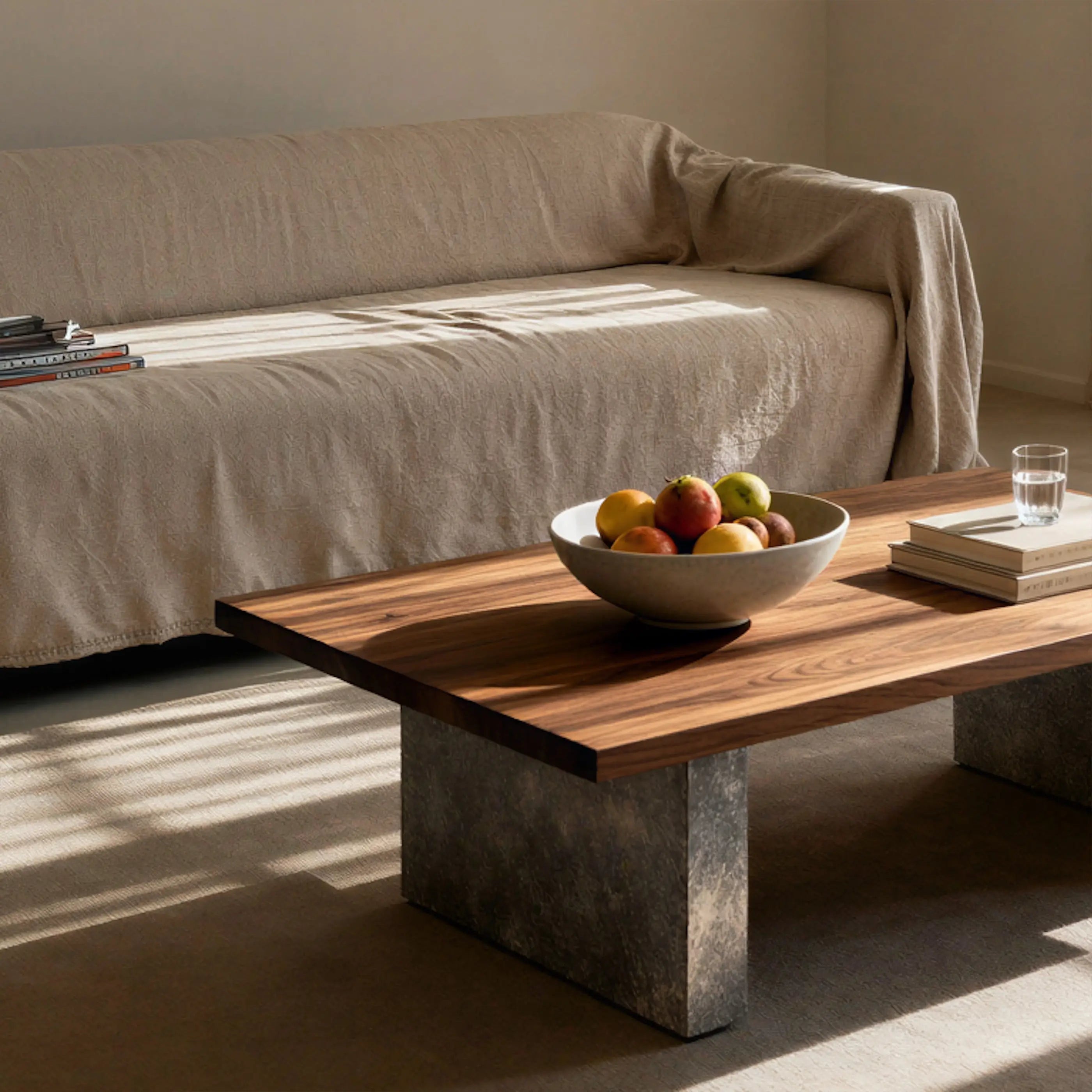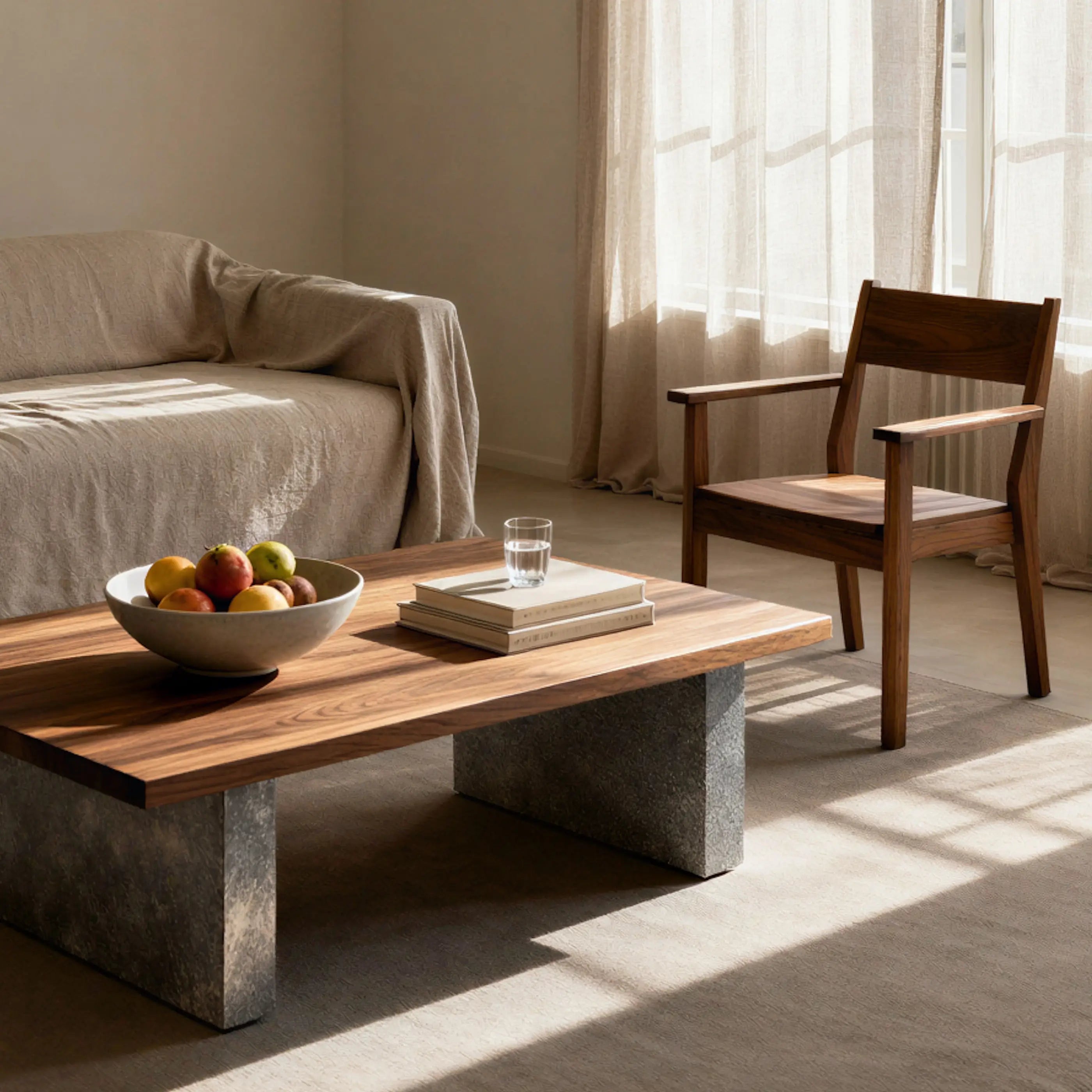 A low coffee table combining solid wood and stone, offering architectural weight, grounded stability, and a calm focal point for modern interiors.